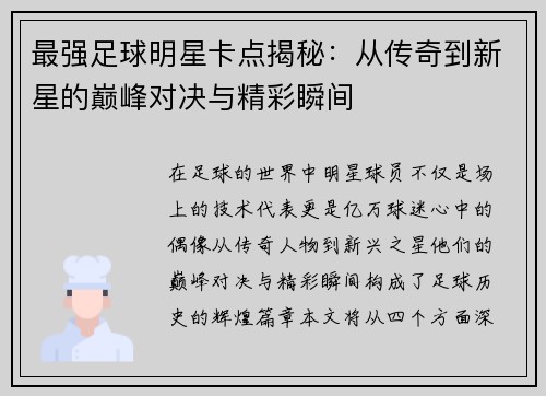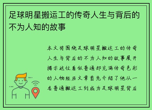 本文将深入探讨名牌解说足球明星背后的故事与成就,揭示他们在职业生涯中的奋斗历程与非凡成就。通过四个方面的分析,我们将了解这些明星球员如何从平凡走向辉煌,他们在场上的表现如何影响了整个足球界,以及他们在退役后所做出的贡献和对年轻一代的激励。文章还将强调这些球员所经历的困难和挑战,展现他们坚韧不拔的精神和顽强拼搏的态度,最终为读者呈现出一个立体而真实的足球明星形象。 1、成长背景与初期经历 每位成功...