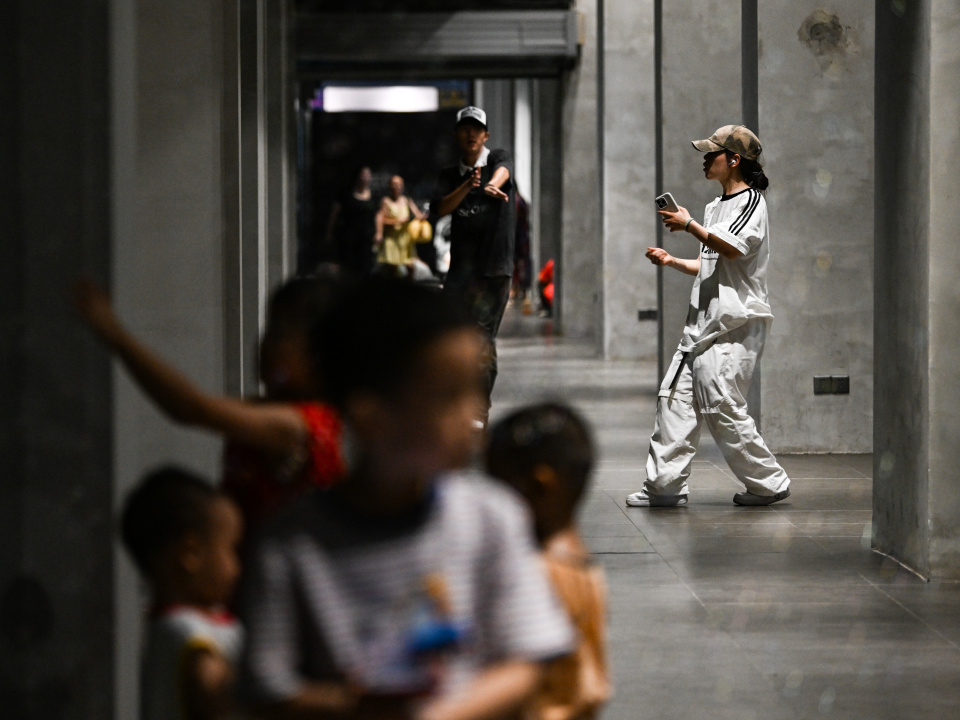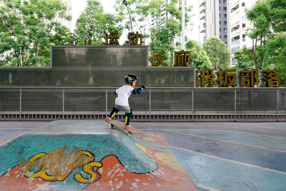 2025年7月24日,小朋友在成都府青桥下运动空间练习滑板。新华社记者 胥冰洁 摄