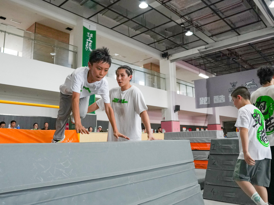 2025年8月5日,在成都一家跑酷训练基地,小朋友在练习跑酷。新华社记者 王曦 摄
