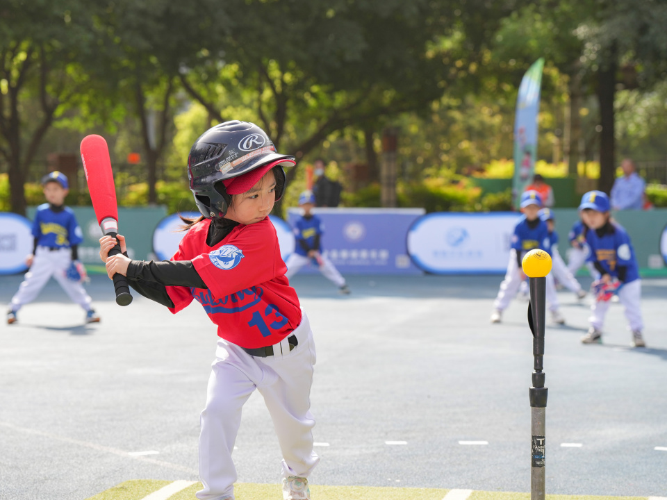 2025年4月13日,在成都高新区举行的一场幼儿软式棒垒球赛中,成都高新区石羊第一幼儿园的马玥阳(前)在比赛中。新华社记者 王曦 摄